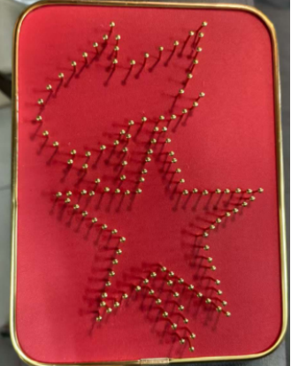 在创作“薪火相传”中,选以红色衬底,搭配金色边框,主体用金色图钉精心排布出五角星与火炬造型,这是中国少年先锋队队徽的经典元素。它通过手工创作的方式,展现出队徽的庄严与神圣,既可以作为富有意义的手工作品展示,也承载着对少年先锋队精神的致敬与传承。