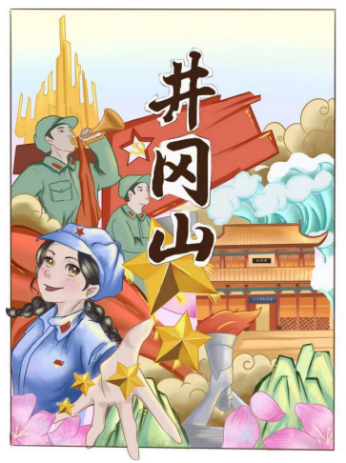 这两幅作品以井冈山为核心意象,融合革命历史与艺术创作手法,生动再现了井冈山革命根据地的红色记忆。画面中的红军战士、闪耀的红星、飘扬的红旗,象征着井冈山“星星之火,可以燎原”的革命火种与坚定信念;背景里的纪念性建筑和山峦花卉,既展现了井冈山的历史厚重感,又体现出这片红色土地在新时代的蓬勃生机。第二幅作品以剪纸艺术为载体,聚焦“红色江西”的精神内核,将江西的红色地标、革命元素与时代符号巧妙融合。画面中,井冈山标识、革命先烈群像、象征信仰的党徽与红星,搭配翱翔的和平鸽、飞驰的高铁,既回溯了江西作为“中国革命摇篮”的峥嵘岁月,又展现“星星之火,可以燎原”的革命火种从这里点燃的历史意义。